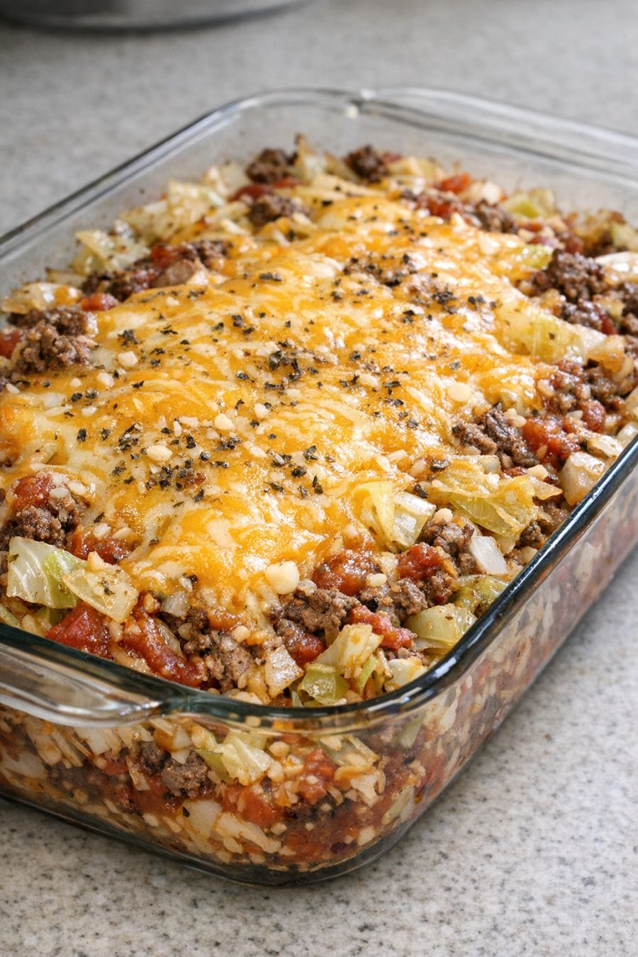 Layer seasoned beef over raw cabbage, along with these 4 ingredients, into a glass casserole dish for a weeknight meal that’s always a yes in my house
