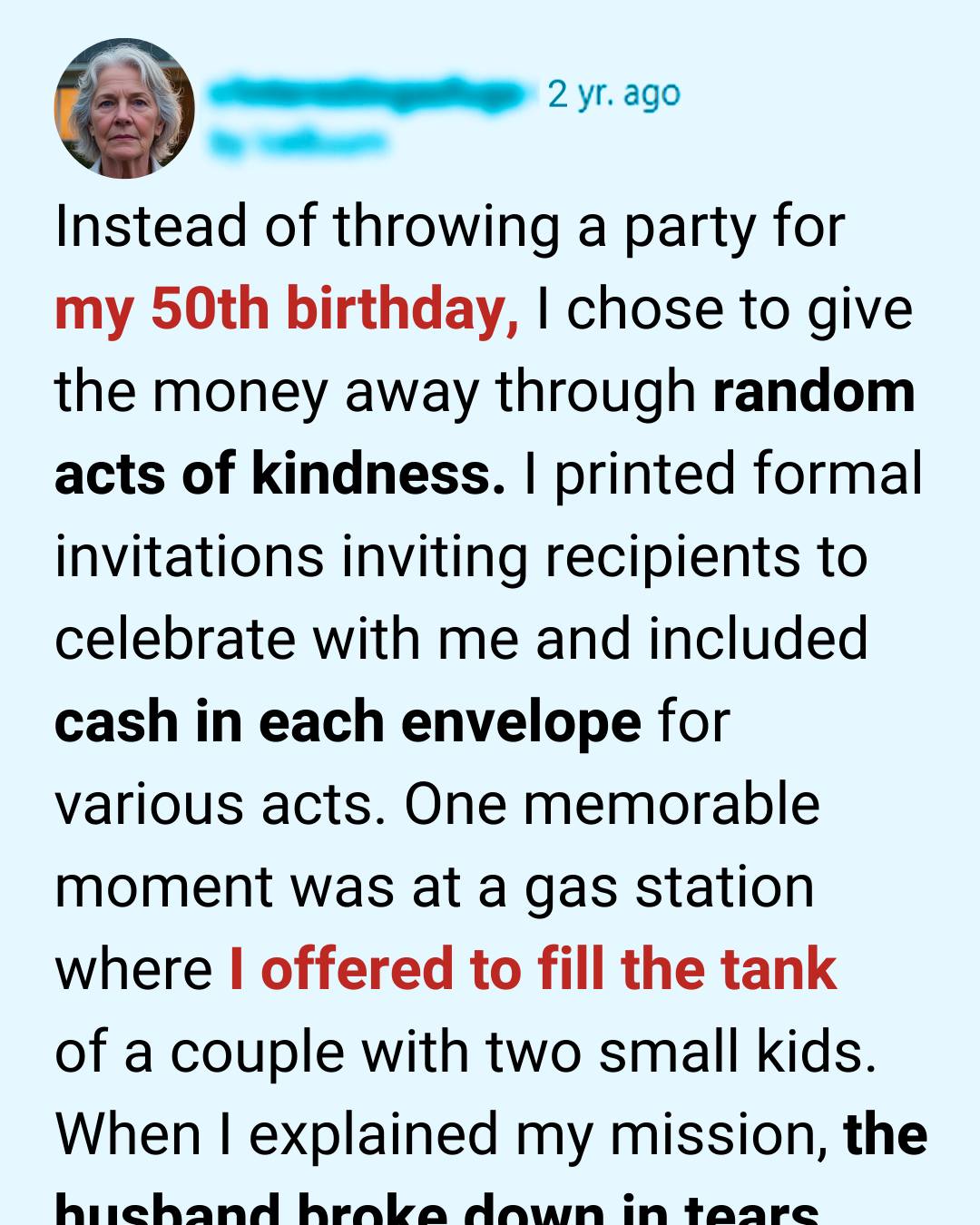 Inside every envelope, I tucked cash in varying amounts, depending on the act of kindness I had planned. Then, on the morning of my birthday, I set out with fifty envelopes and a single mission: give them all away through fifty random acts of kindness.