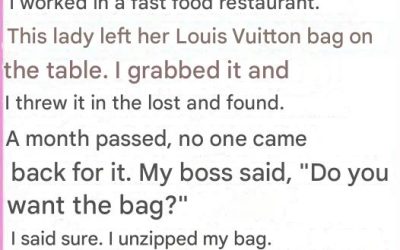 Once, while working at a fast food restaurant, I discovered a woman’s Louis Vuitton handbag on the table. After waiting…